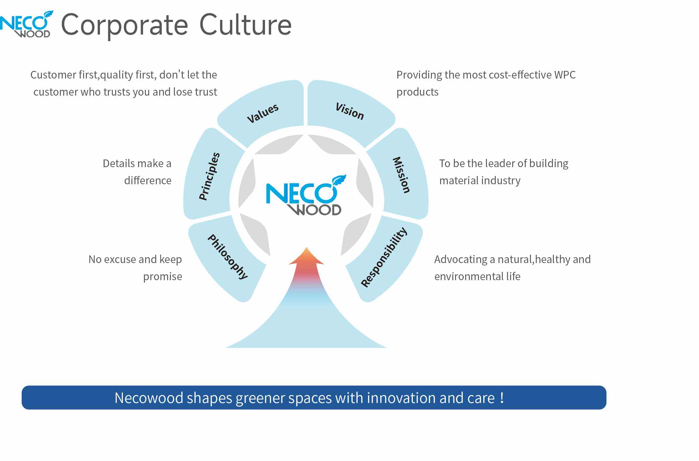 Necowood fungerer med en dyb forpligtelse til at blande teknologi, håndværk og kultur. Når vi ser mod fremtiden, forbliver vi dedikeret til at udvikle intelligente, smukke og ansvarlige WPC -løsninger til bæredygtig arkitektur.
